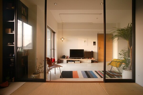 每個人總有一些「小確幸」, 外婆家的日式老房舍,對於男主人而言是最美好的記憶,加上施穎瑩也愛喝茶,兩人便打造了一間日式榻榻米茶室,讓造訪的朋友,也能享受到藺草香、龍眼炭香與茶香,在這空間中,特別選用無邊縫製的藺草榻榻米墊,更顯樸質,也有著他收藏的自在鉤、鐵壺、陶製火炕、老茶、玻璃紅茶罐,一道穿透性的玻璃拉門,拉開後榻榻米就是沙發,門關上兼具客房功能。