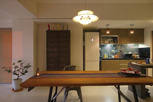 男女主人同樣喜歡收集古董傢具,施穎瑩愛老台灣味,舊時期的醫生櫃、檜木餐桌、媽媽傳給女兒的嫁妝樟木箱,配上老公收藏的北歐老燈具和工業風格舊鐵櫃,東西方碰撞,一點也不突兀。