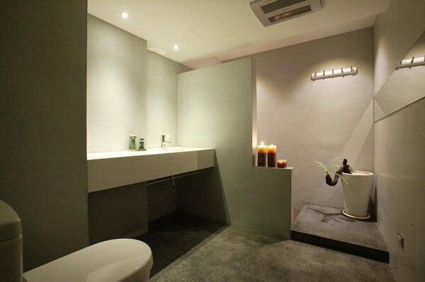 ↑ 浴室不粉刷油漆,以會呼吸的水泥作粉光處理,能夠防潮也別有風情。