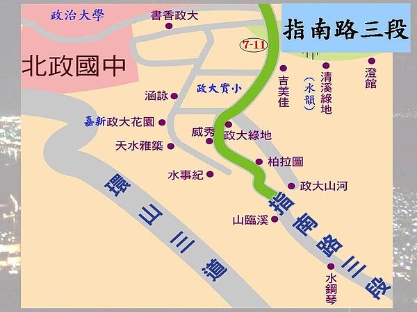 政大重劃區位於北市文山區指南路3段,可謂「上達貓空、下達政大」,除了可享受貓空的山林雅境外,同時也享有政大商圈的生活機能,區內有明星學校政大附中,待12年國教實行後,或許一路直升到政大不是問題,聯外交通前往公館、信義區及東區都相當便利,未來還有捷運南環線,後市增值可期。