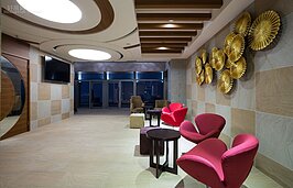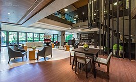 迎賓藝術大廳、梯廳閱信區、音樂商務區、品茗咖啡區、親子區(桌遊區、圖書區)、防災中心區及造景親水中庭花園。