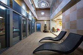 公設比佔30.89%,扣除社區獨立車道,其餘1樓空間為社區公設,項目包含:挑高達7.2米迎賓大廳、商務會議區與複層圖書閱覧區並採用可全開式觀景落地窗連接社區中庭花園,更要提及的是在建築物最具價值的360度環景屋冠層以雙樓層規劃:空中環狀散步道、多處觀景休閑空間、長庚生技無邊際觀景池、體適能健身空間⋯⋯等。
