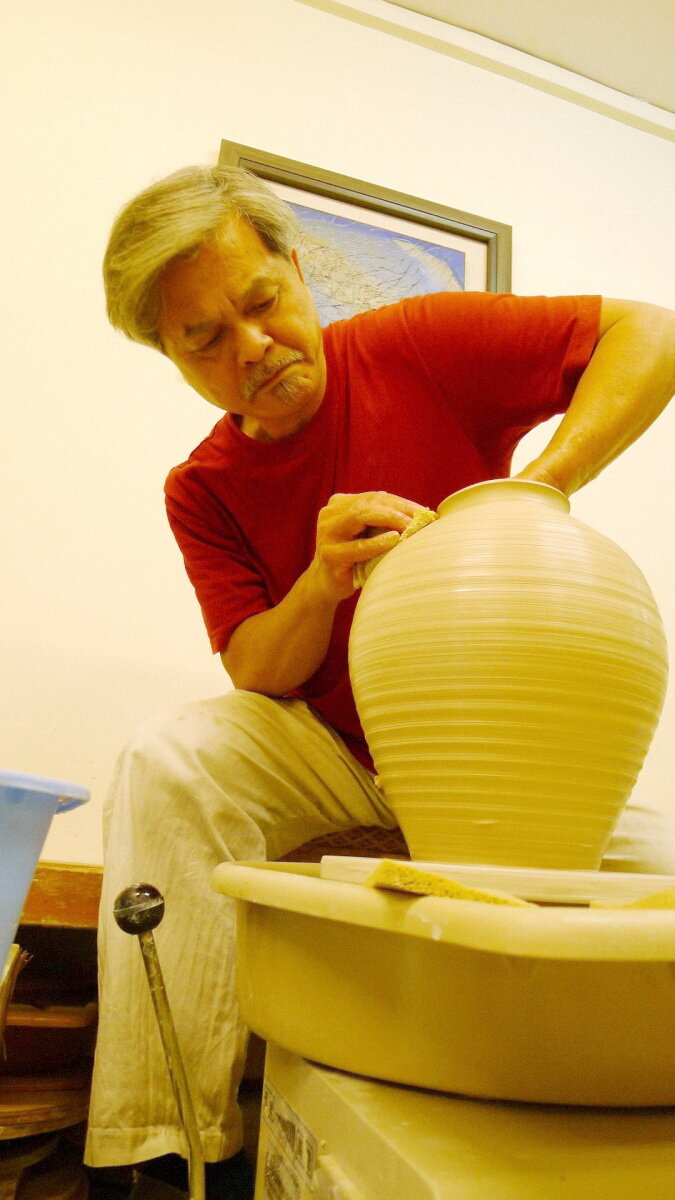 楊正雍-台灣本土陶藝家,從事創作及教學多年。於1985年在八里龍米路現址成立「雍華窯」,1300℃的高溫還原燒成,溫潤清雅的質感,蛻變於傳統,於樸質中顯華麗;近年他以「荷風」創造出許多作品,在創作技術上,顛覆了傳統對稱工整拉坏手法,運用曲線的流暢美感,表現風吹荷動的自然之美,深具人文典雅浪漫的氣息。 |