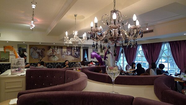 餐廳的裝潢有一半是紫色的半開式包廂,另一半則是以黑色雕花布沙發為主的用餐區;靠近忠孝東路的窗邊垂掛著紫色窗簾,窗外的車水馬龍,和店內氛圍形成強烈對比。店裡的風格和浪漫的蕭穎很接近,「我自己的房間也是以紫色為基調,加上水晶吊燈佈置,所以這裡完全是我夢想中的餐廳。」