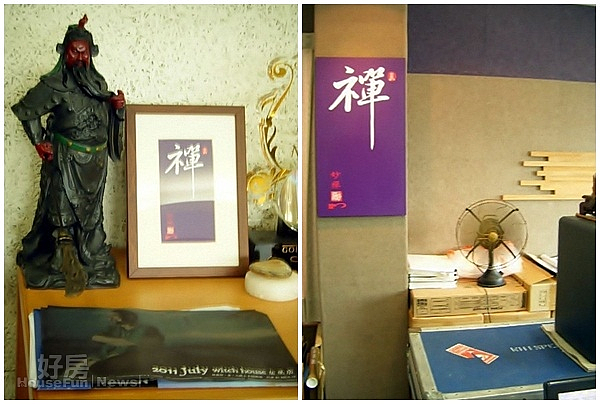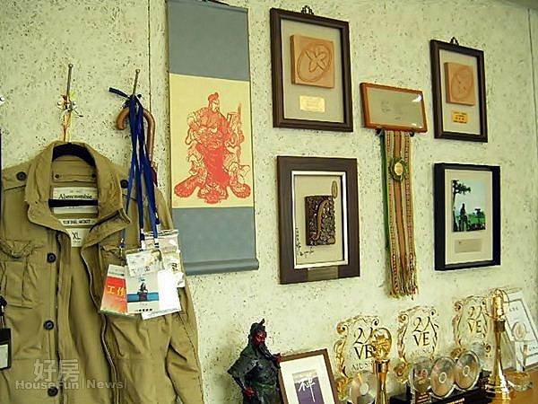 工作室中陳列著許多他得獎的獎盃,牆上掛著卡其色的工作服、來台工作證,他透露,自己特別崇拜關公,所以請來關老爺作伴,不論是帶刀關公的雕像,紙雕春秋關公的錶畫,加上斗大的「禪」字,充滿意境,連電風扇都是復古造型,流露著他對台灣文化的熱愛和儉樸的性格。