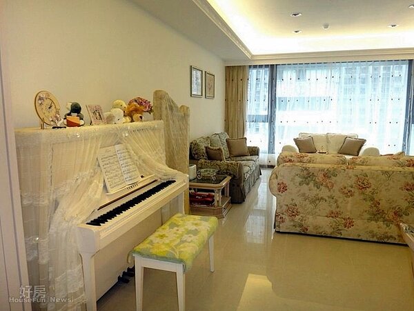 客廳旁還擺設了白色鋼琴,增添音樂氣息