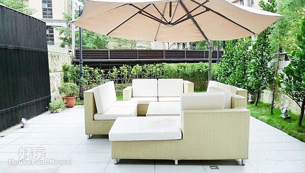 超大的庭院擺放白色沙發,朋友可來此烤肉聚餐