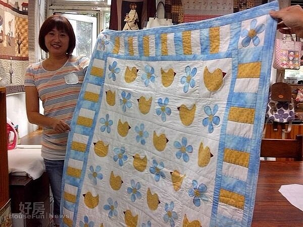 王惠珍的老公是位畫家,目前教室內前半是王惠珍的拼布教室,而後半部則是老公胡坤隆的作畫教室,夫妻倆形影不影,而如今已11歲的兒子愷弟,是她拼布創作的泉源之一,如近來火夯的黃色小鴨,其實當愷弟4歲第一次上幼稚園時,惠珍就幫兒子做一件小鴨被,因為當時小鴨子是愷弟最愛的玩具,為了讓他中午在學校睡午覺時有安全感,所以縫了這床被子讓他帶去,沒想到一晃眼愷弟已經五年級了,剛好,最近黃色小鴨超夯,她也在臉書上與大家分享這溫馨的黃色小鴨涼被。
