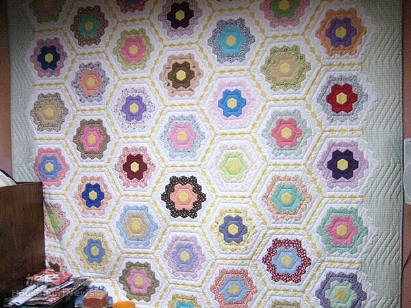 在她拼布教室入門的牆上,還掛了一塊200x180公分的大拼布壁畫,她說那是由兩千多個拼布一針一線細細縫製而成的作品叫「祖母的花園」,她可是花了一年的時間才完成的,當然,這是非賣品,是自己收藏的得意成品。