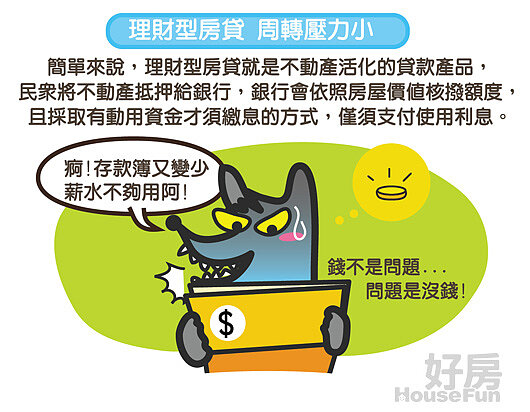 若為預防計劃趕不上變化,能夠有一筆可靈活應急的資金,則可以選擇利率不到3%的理財型房貸。概念是將不動產抵押給銀行,透過將已償還的本金部份,轉化成可以活用的理財額度,讓你在付房貸的同時,還可以循環累積一筆理財或周轉金,以備不時之需所用。