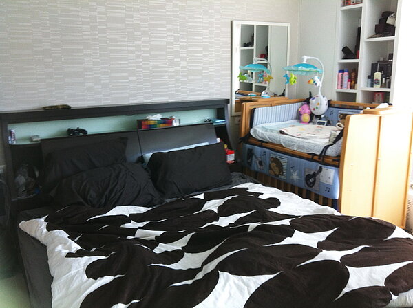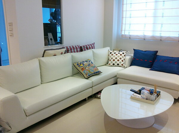 郭人豪新家權狀60坪,實際坪數近40坪,由於買的是實品屋,已經裝潢好,所以沒花半毛設計費,含車位將近3千萬,1坪大約50萬。「當初跟老婆一進門,就被白色美式風格吸引,80x80的拋光鏡面地板、大理石電視牆、開放式層架、白色L型皮沙發跟心型茶几,非常齊全,而且每個房間裝潢都不一樣,更棒的是三面採光,感覺寬敞,當下就動心。」