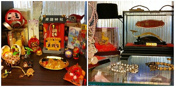 「老師說,門一打開,不要直接對廳堂,不要看到灶,不要直接看到廚房,所以門口做了小玄關,玄關處放了一些招財小物。」玄關櫃子裡擺觀音神像、黃金玉如意、日本招財御手還有招人緣的水晶球,另外來自泰國的四面佛以、裸體招財女神,非常「齊全」,「女生要有桃花就會有財嘛,招財女神等於展現她婀娜多姿的一面,然後就是招人緣。」家一開門就能見財,又能避免開門見廳的缺點。