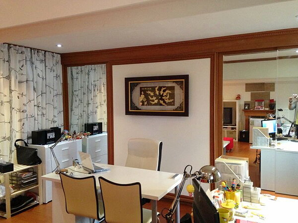 客廳的空間夠用,可兼會客室和藝人上課場所,為了營造出家的感覺,紅色布沙發、紅白相間的茶几和電視櫃、辦公桌等家具,全都是他親自到賣場挑選,有些矮櫃還是他親手組裝。」孫協志「校長兼撞鐘」,自己當老闆,還要組裝部份家具,說穿了就是要省錢啦。