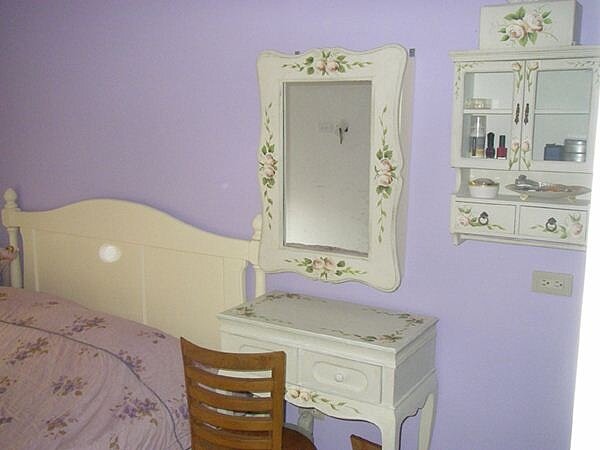 另外,為了偷空間,樓梯選擇以迴旋式做成空心梯,空間運用稍廣。進房前的玄關,她刻意訂製了展示櫃和燭檯,讓進房前多點情趣,主臥約4坪大,放得下一張雙人床,床組加上整套的化妝檯鏡,小櫃子,還有床頭櫃,全部加起來居然只要兩萬元。
