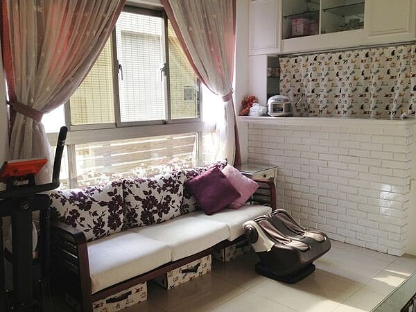 客廳僅2、3坪,不過沙發、電視櫃都齊備,還能放一台按摩機跟跑步機,上頭掛了吸頂式水晶燈:「我自己畫圖,請木工製作電視櫃,足足省了一萬元。」沙發則是「借屍還魂」的:「沙發是媽媽在15年前交接給我,我換了沙發套,6千元就解決。」不讓沙發底下的空間浪費,王薇還特別買了三個收納箱放雜物。