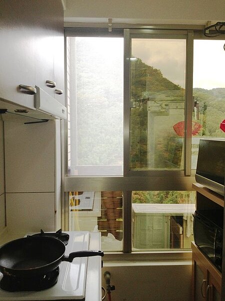 廚房空間很小,不僅有全套廚具,還有吧檯內邊的收納,加上一台冰箱,要擠兩個人,轉個身就會碰在一起,王薇老公有很好的理由不進廚房幫忙呢。另外避免油煙飄到客廳,王薇選用防水窗簾,方便定期拆下來清洗,吧檯內外的上方,都有櫥櫃,方便收納,廚房已經夠小了,還硬是要放個3層架,微波爐、烤箱一個也沒少。