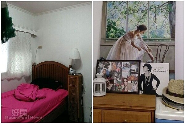 房間不大,只擺放單人床;臥房的櫃子上擺著何嘉文收藏的小蠋檯、油畫