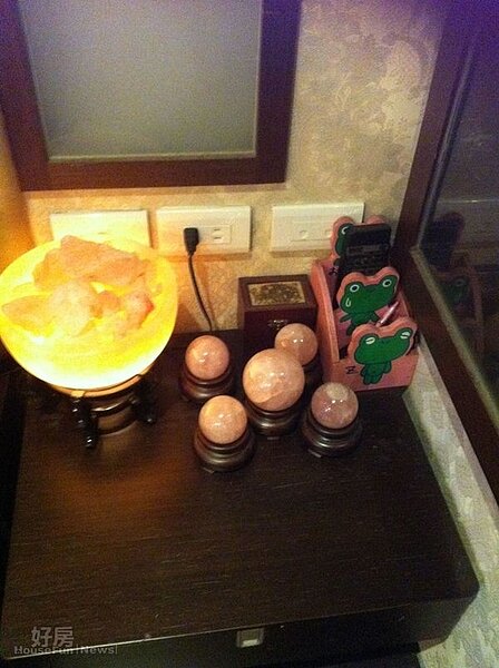 而楊繡惠的主臥,雖然看起來不大,但其實別有洞天,走紅色熱情風格,一張大床、電視櫃是基本配備,當然還是少不了財位。「房間大門對角,老師說也是我的財位,所以上面全部都放錢。」連床邊櫃上都有玄機,擺了鹽燈與粉紅色水晶球。「跟客廳一樣,臥室也放鹽燈,據說可以鎮宅、避邪、淨化磁場,這個則是人緣桃花球,這是我最需要的。」