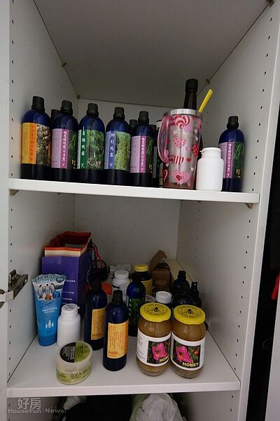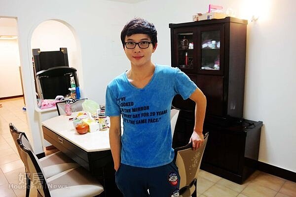 廚房裡有著L型的流理台,至少三坪大,但陳孝志說家裡不常開伙,雖然有放餐桌,但家人很少在這裡用餐!家裡一共五間房,來到他的房間,才見識到他愛美的程度,房間整理得井然有序,但誇張的是桌上擺滿了瓶瓶罐罐,全是他每天用的保養品。「這罐鴕鳥精油可以舒緩筋骨,還有絲瓜水、乳液,都是用來保養皮膚。」