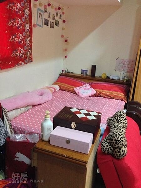 超愛點點的她,被單是卡哇伊的粉紅色,還有一個男朋友抱枕