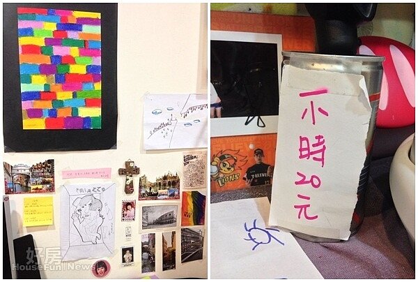 牆上有許多照片與收藏品(左);桌上有個註明一小時20元的筒子,想吹冷氣先投錢(右)