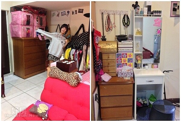 套房雖然小,阿諾還規劃了更衣間(左);純白的化妝台,擺放了香水與保養品,還挺有模有樣的(右)