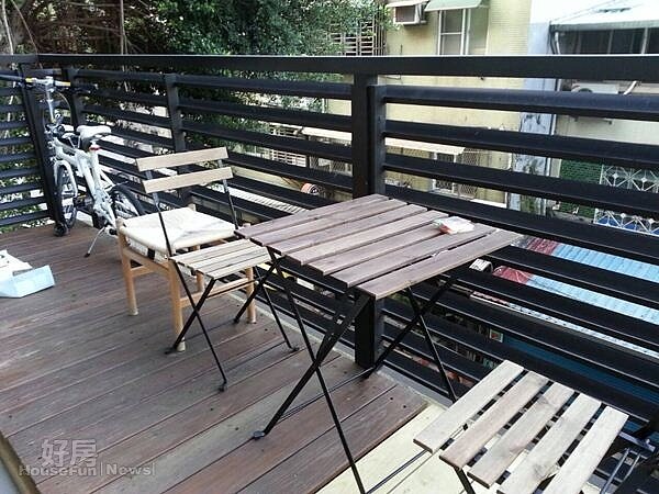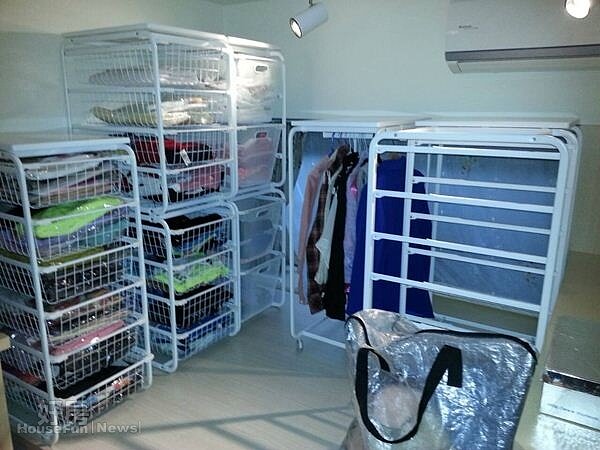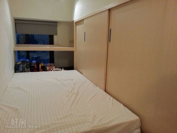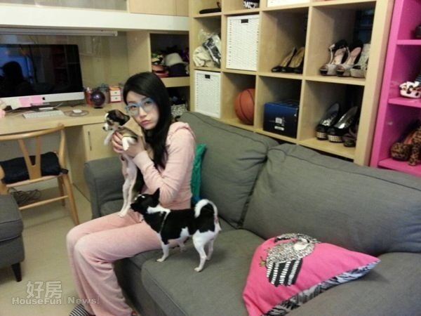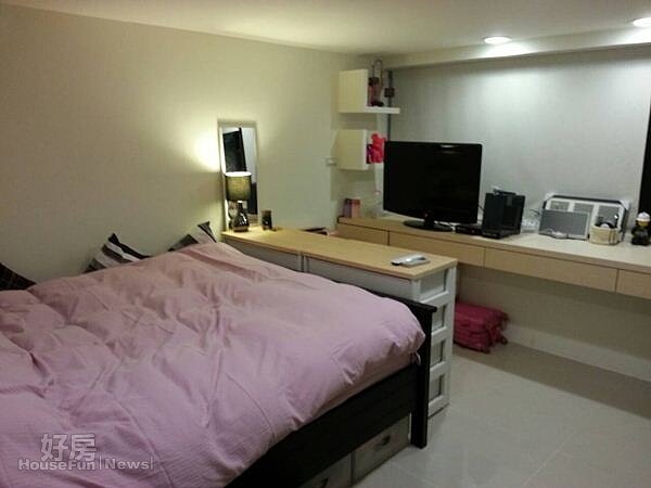 不過由於她一個人住,因此樓上兩間房,都成了她的更衣間,其中一間還是她自己打造的。「這些層架都是我自己買回來,然後與朋友一起組裝,上面的衣服都分門別類,找的時候很方便。」主臥房大概有4坪,擺了一張大雙人床與床頭櫃,收納的空間從衣櫥到衣櫃,一樣很多。「這裡一樣有對外的窗戶,一打開外面就是公園,有時早上還會被鳥叫醒呢!」
