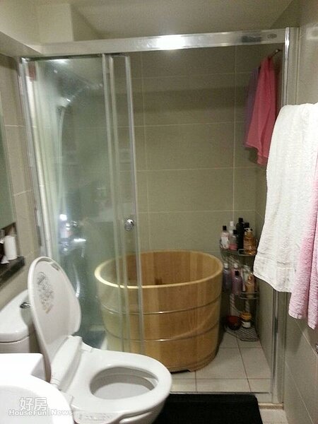 浴室採乾濕分離,愛泡澡的恩琦還買了檜木桶