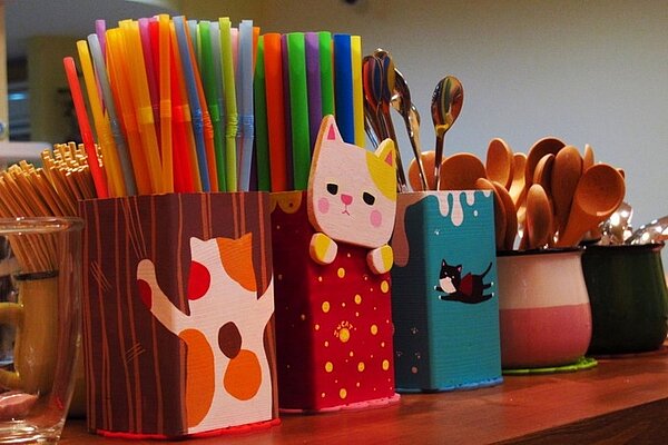 「凡事自己動手是全家人的共識。」除了木工,放眼所見,都是自家人完成,包括吧檯上放吸管的罐子,也都是全家人一起彩繪,另外,姊姊吳臻有繪畫天份,為了完成妹妹的夢想,也協助畫了很多貓咪畫作,並掛在牆上展示,每每獲得顧客的讚賞。