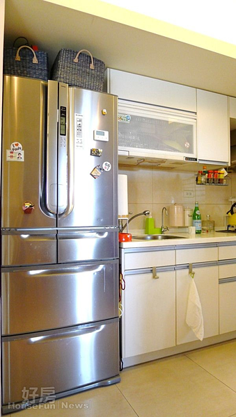 白色廚具加上不鏽鋼冰箱,廚房的另一頭有個中島設計,是區隔客廳和廚房間的重要「門檻」,除了吃飯的時候,貴婦奈奈許多文字上的創作,就是在這裡完成。