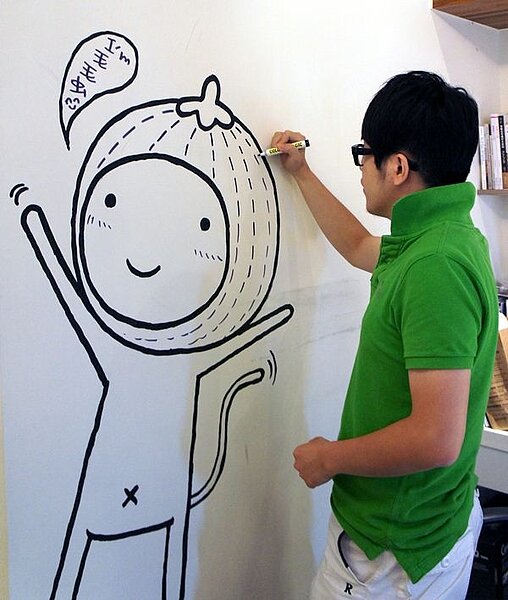 ↓靈感一來,毛毛蟲就會像這樣拿起麥克筆直接在牆面上繪圖創作