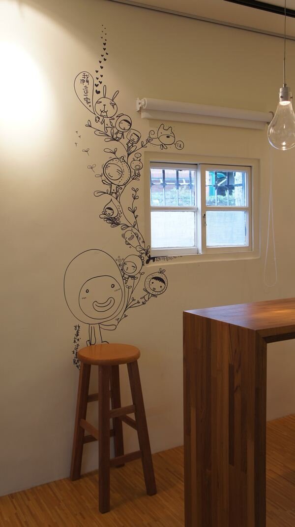 除了親手打理裝潢,毛毛蟲也擅長將繪圖插畫融合在室內設計中,工作室四處皆可見到他信手捻來的繪圖創作,巧妙融合在窗框、開關、門面等處,毛毛蟲說:「這是將室內設計結合繪圖插畫的創作方式,平時只要靈感一來、或有媒體登門採訪,就可以直接在『牆面』上即興創作,若不小心畫滿,只要用砂紙磨過處理、批土後再上幾道面漆就能恢復牆面原貌。」