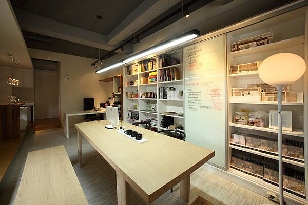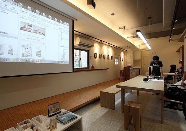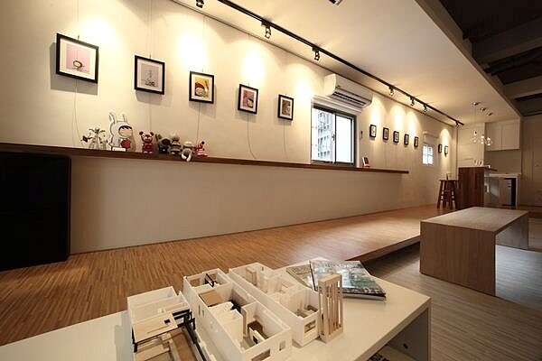 首先是入口部份,毛毛蟲特地將地板架高、視覺上採以藝廊風格呈現,將包括繪畫板、周邊商品或書本等個人作品一字排開陳列在牆璧及木架上,讓人一進門就能立即感受到輕鬆愉悅的氛圍;而藝廊延伸到盡頭為吧台區,這裡則為能讓員工放鬆心情的休息區。除了入口處精心的藝廊佈置,毛毛蟲完美運用「Open」概念,將工作桌後方書櫃在拉門上導入白板拉門,或是入口右側舒適沙發區,天花板上隱藏了下拉投影布幕,在不破壞整體設計感同時亦結合多功能的實用性。