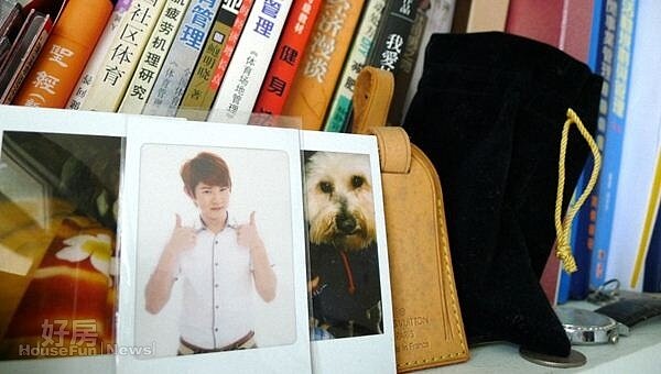 ↓書櫃裡擺放著自己和狗狗的照片