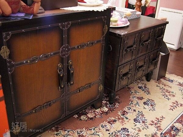 室內三房兩廳的格局,主臥房堆滿了花猴的戰利品,「廠商送的、自己買的,大大小小堆到都快放不下,只好委屈老公的私人物品,暫時在客房中借放。」花猴一直夢想著要有一個比她身高還要高的珠寶櫃,但遍尋不著,最後老公上網找,在一家外銷工廠,找到了和她想像中一模一樣的櫃子。