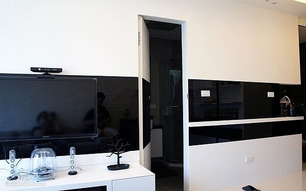 看似簡單的黑鏡電視牆,實際上巧妙將陽台與廁所隱藏起來