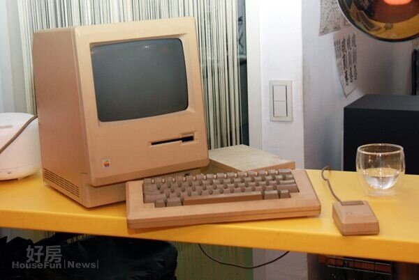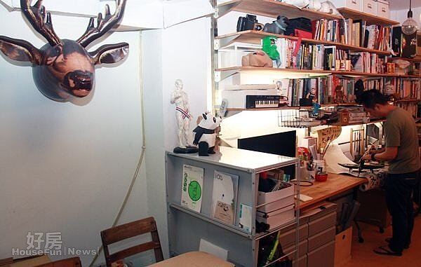 走到底則是馬予路主要的工作空間,除了電腦桌與滿牆的創意,裡頭一大片白色磚牆也是他的idea。「這面是當初我請師傅把水泥牆打掉、露出裡頭的紅磚牆面,再上白色油漆完成的,底處再加了一整排黃光鎢絲燈使視覺更有氣氛。」除了充滿工藝風的巧思,最令人驚奇的還有書櫃上的各式懷舊珍藏品,包括80年代的Keyboard、任天堂紅白機、老夫子公仔、甚至還有一台幾近絕版的Apple初代桌機,居然還能開機使用呢!