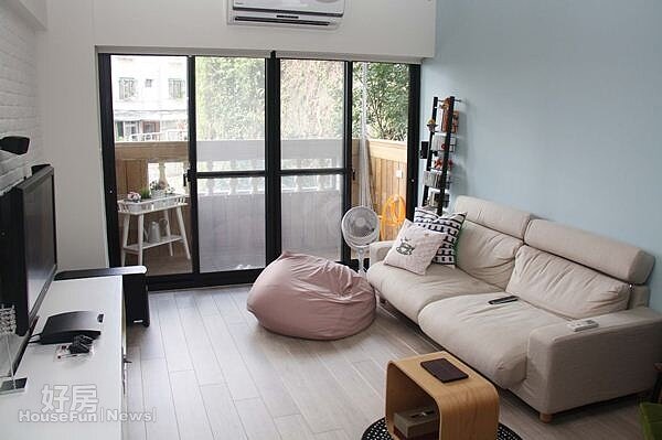 實木地板、簡單幾樣傢俱、加上落地陽台,輕易構成一幅充滿美式鄉村風意象