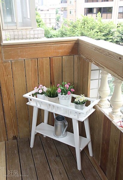 夫妻倆將原本氣密窗外推打造出木製落地陽台,再擺上盆栽裝飾,乍看下彷彿讓人置身國外度假別墅
