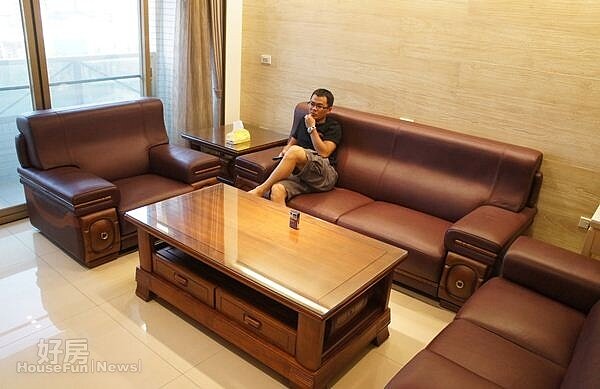 雖然客廳裡包括皮製沙發組、茶几桌皆走深色系,不過拜大坪數與樓層夠高所賜,並不會影響到採光效果