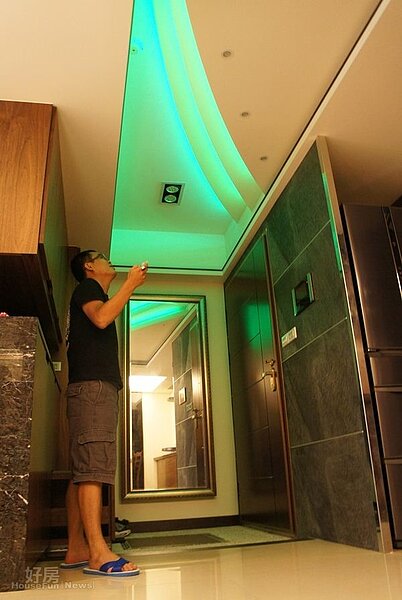 玄關天花板彷彿水波的多層次造型燈,可切換多種色彩模式,讓人猶如置身夜店,是個蠻跳tone的設計