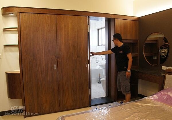 主臥室在原本整面白牆上加進一組櫃櫥,並巧妙把浴室隱藏在櫃門後