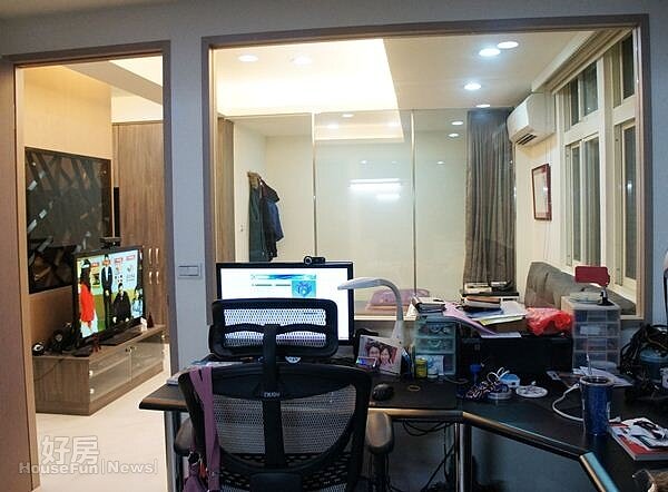 客廳空間以組合式沙發、造型茶几與紅色長皮椅等現成傢俱組成,一旁的工作室與和室則皆採用大片玻璃,動物先生說這是基於採光考量,「我們家只吃單面採光,因此工作室與和室才會故意採用大片玻璃增強採光效果,儘管少了點隱密性,但這部份加裝窗簾或百葉窗就可解決。」