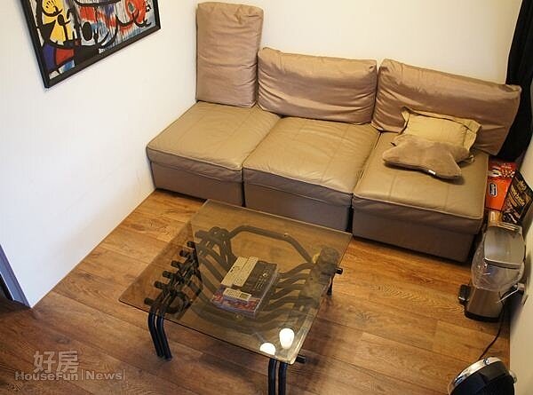 客廳空間不大,整體佈置以簡單舒適為主,包括造型茶几桌、抽象掛畫…等皆各具特色