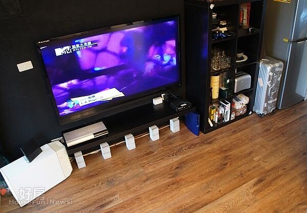 首先,將白牆漆黑變成電視牆、釘上層板當成電視櫃,搭配著一旁擺滿紅酒、公仔等特色收藏的功能櫃,Craig用最簡單的方式露出主人的個性與品味;至於腳踩的地板則採用德國進口的木紋貼皮,這當然也是Craig精心挑選的,包括透氣度、耐磨性都相當不錯;當然最重要的是,由於客廳位置就在頂樓且兩面採光,因此完全不需擔心光線問題。