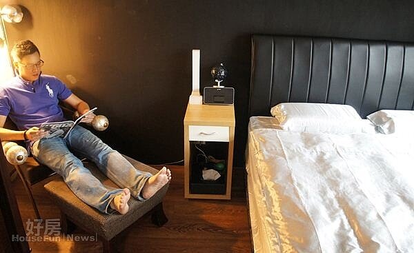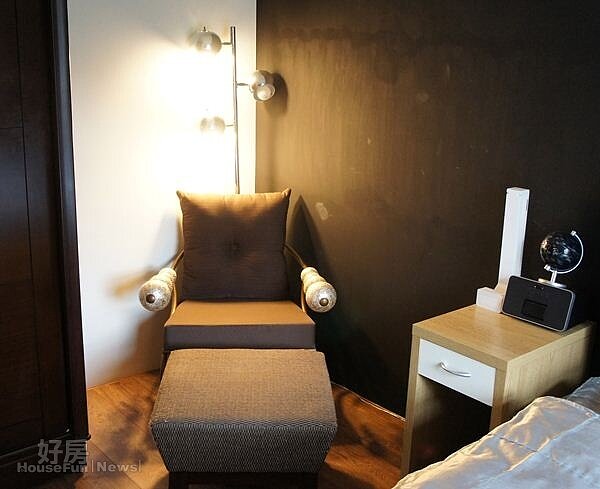 臥房部份,Craig也是盡可能以品味傢俱營造出空間質感,價格12萬的雙人床來自寬庭蠶絲寢具組,而臥房內唯一一張造型座椅,也是托人從義大利帶回的,「這張椅子扶手造型設計的金璧輝煌的、且充滿一絲神秘感,當初看到就非常喜歡,於是拜託友人帶回,後來上網一查才知道這叫做國王椅。」其他像是樹幹造型LED燈、床頭櫃…等也都各具特色。至於五樓則是Craig買來給父母住的,空間規劃上就以長輩喜歡的簡約舒適為主。