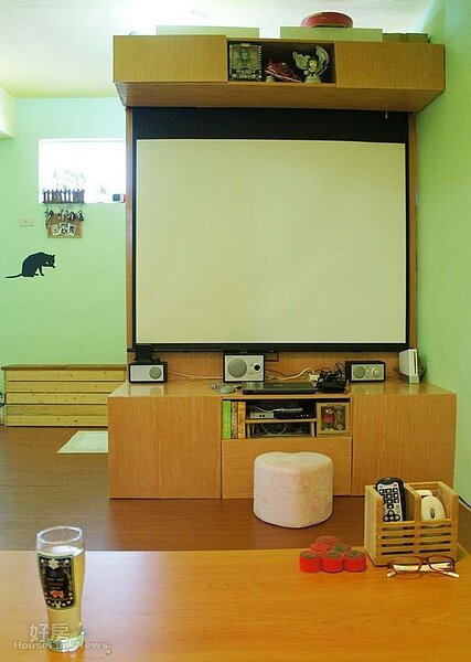 包括門口的坐式鞋櫃、雙面櫃或客廳桌,全取材自廢棄床舖手工打造成。「DIY好處是能打造出獨一無二的傢俱,例如門口雙面櫃就結合鞋櫃與電視櫃功能,而且我也沒有擺電視,而是將投影機架在廚房吧台上方,如此不但可欣賞大螢幕、也可當成工作桌使用;另外像是客廳桌也結合書櫃與收納機能,這些幾乎都是用廢棄的床板自己裁切慢慢做出來的,有些細節可能因為計算錯誤產生誤差(例如櫃門關不緊),不過我覺得這些NG傢俱也有一種粗糙美感。」