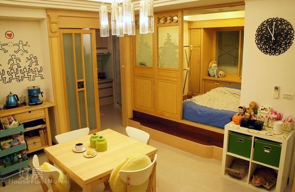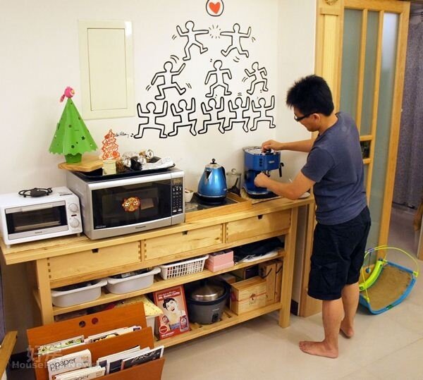 至於客廳與餐廳間也以舒適躺椅、造型閱讀桌簡單區隔,一旁緊臨著廚房拉門的,則捨棄傳統笨重龐大的餐櫃,改換上一張鄉村風多功能木桌,桌面上烤箱、微波爐、咖啡機…等依序擺齊,搭配牆上充滿活力的壁貼,透過創意佈置瞬間為空間注入活力。