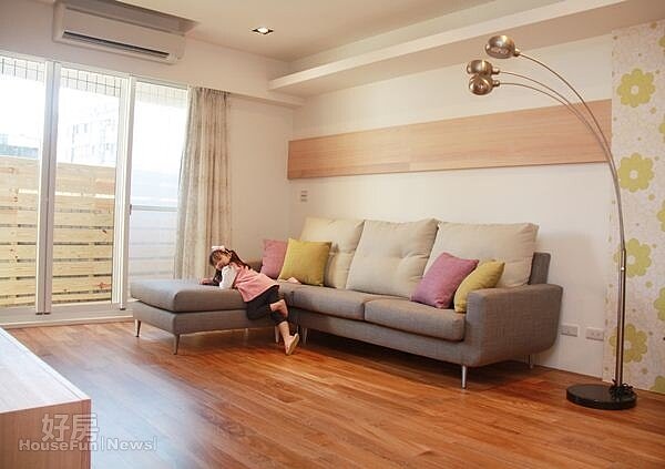 客廳空間僅以簡單的沙發及造型燈佈置,空間寬敞加上採光佳,非常適合孩子自由活動
