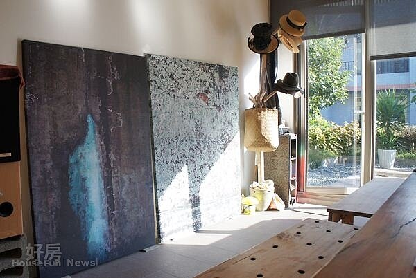 門口處的DIY造型衣架、一幅幅靠牆擺的是兒子攝影作品,佈置上可見藝術家不受拘束的隨興風格